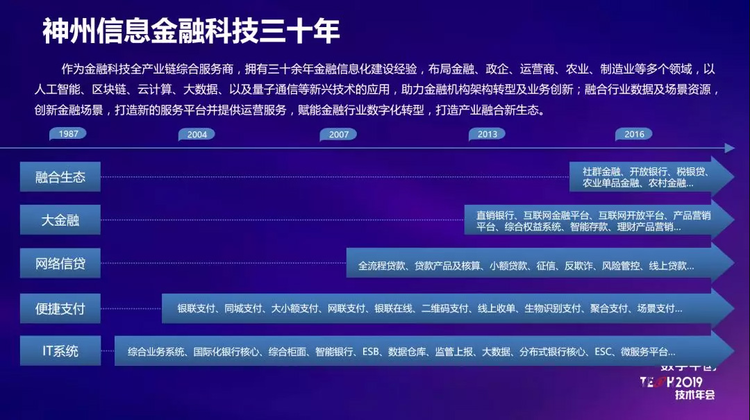 从定义来看,神州信息认为金融科技的发展可追溯到2004年之前。发展到今天,它的业务内涵已覆盖五个层面,这也是它发展的五个阶段。